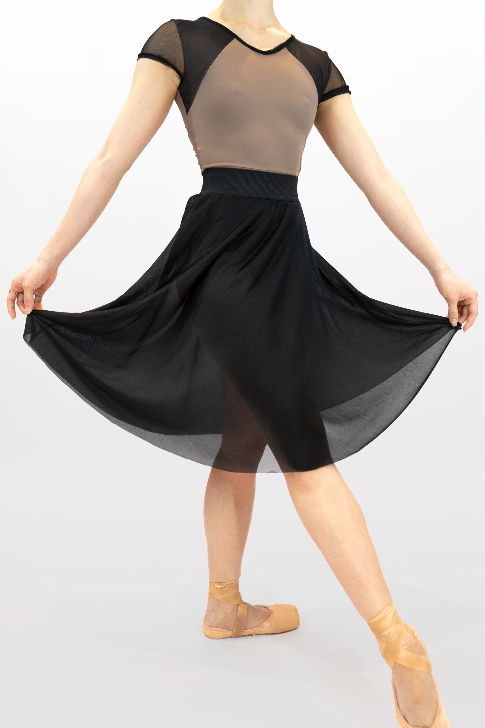Knee length circle skirt with an elastic waistband that sits firmly and flat to the stomach.